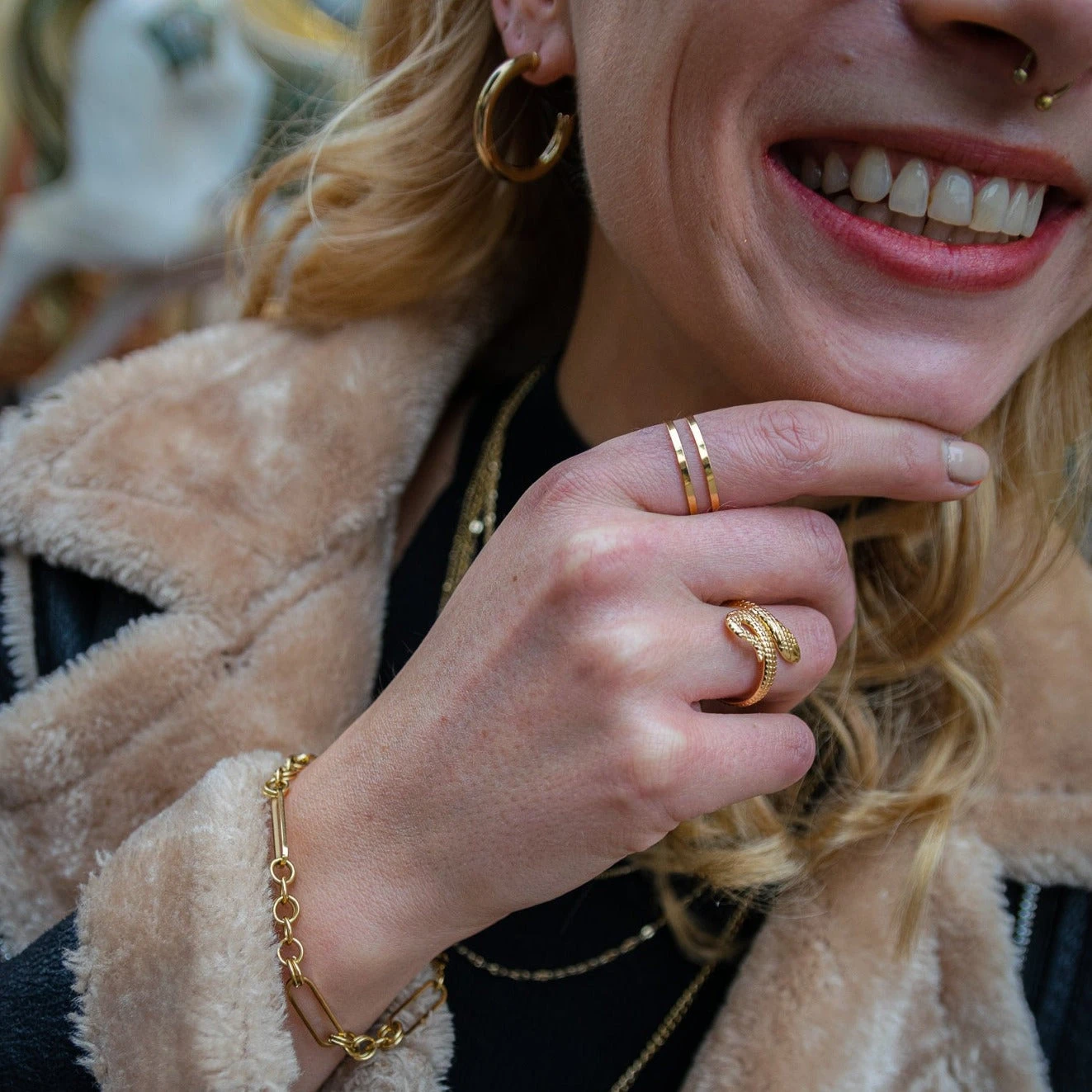 Anillo de plata doble y ajustable. Al ser un anillo ajustable puedes usarlo en desde la talla de la 10 a la 16 y la 16 a la 20.