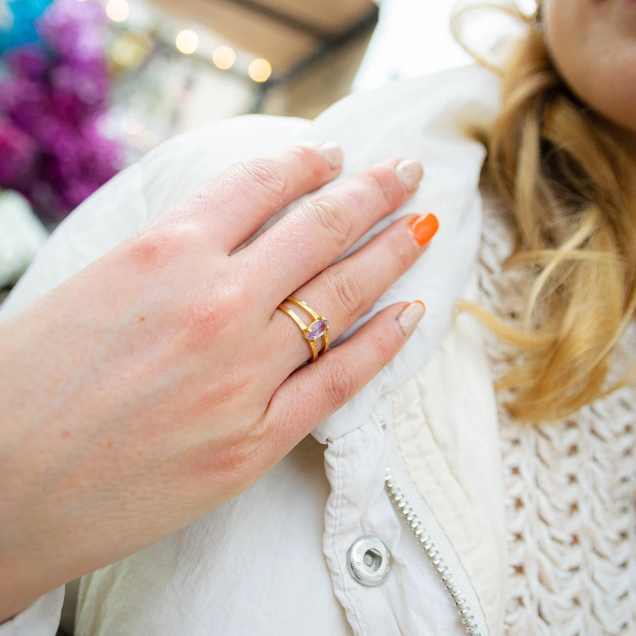 Anillo de plata con doble banda y piedra oval engastada. Disponible en varios colores de piedra.