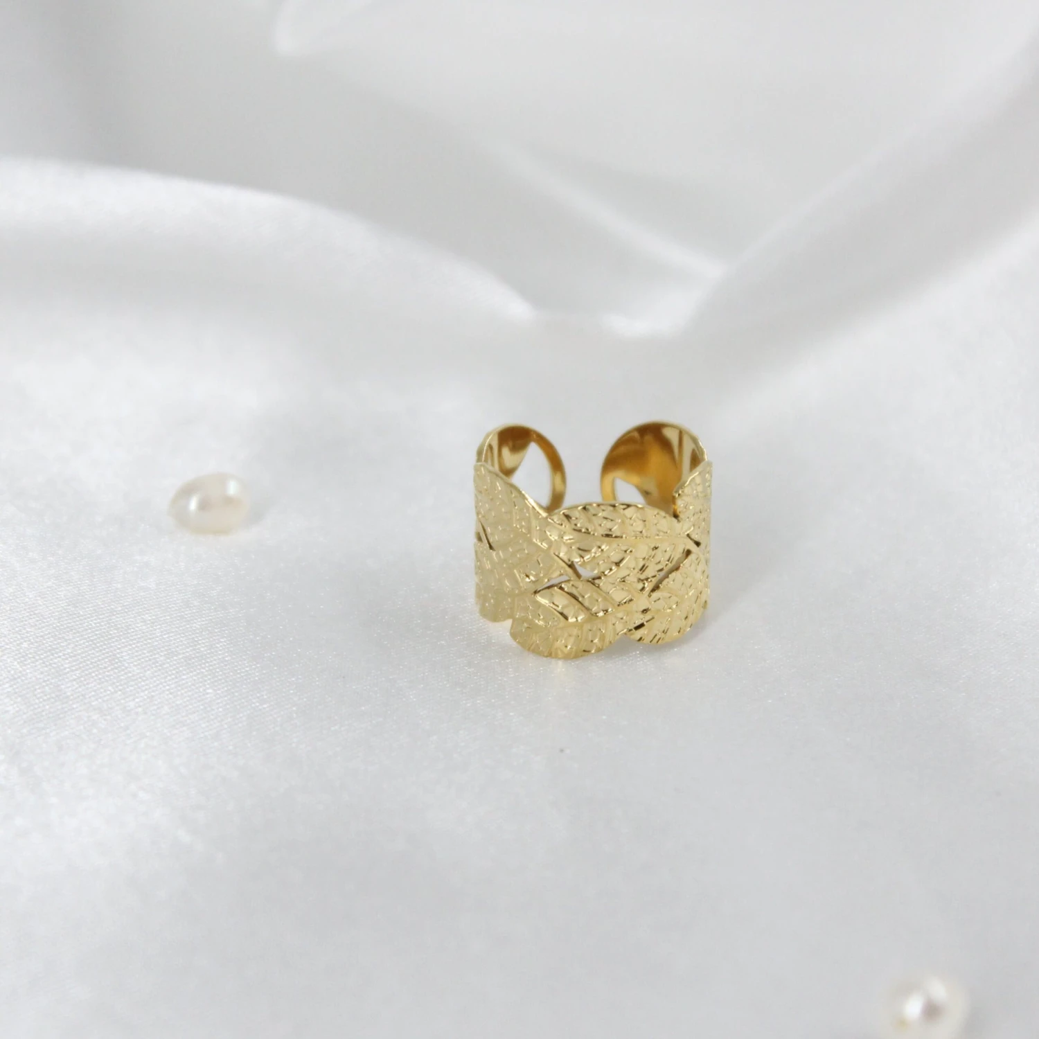 Si te gusta el tipo de anillo grande esta es tu elección perfecta, con su delicado diseño troquelado y con textura hará que este anillo ajustable se convierta en un ideal para tu día a día o si tienes algún evento más especial, su textura de hojas realiza la combinación perfecta entre lo elegante y moderno