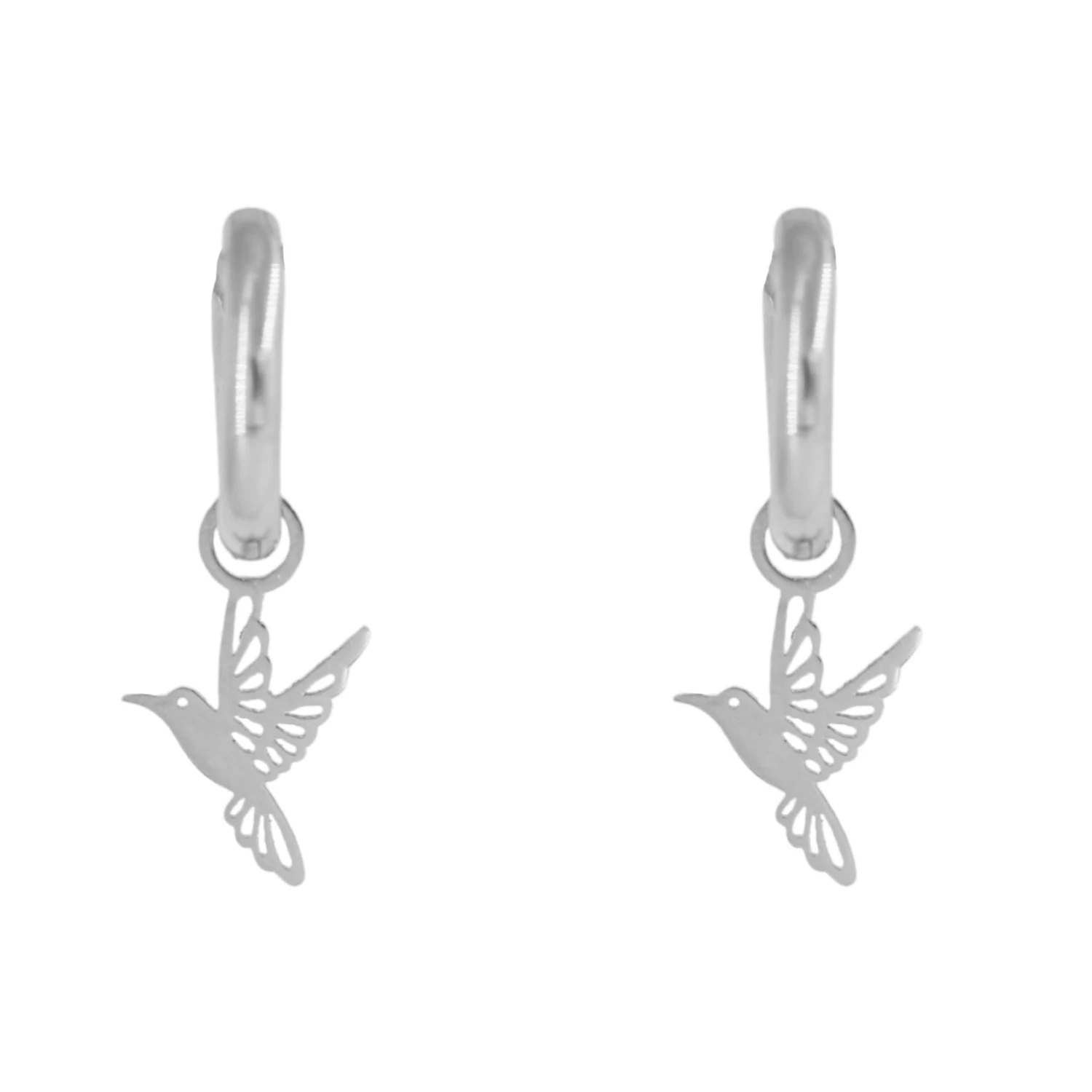 Aros y Charm de colibrí fabricado en acero inoxidable.