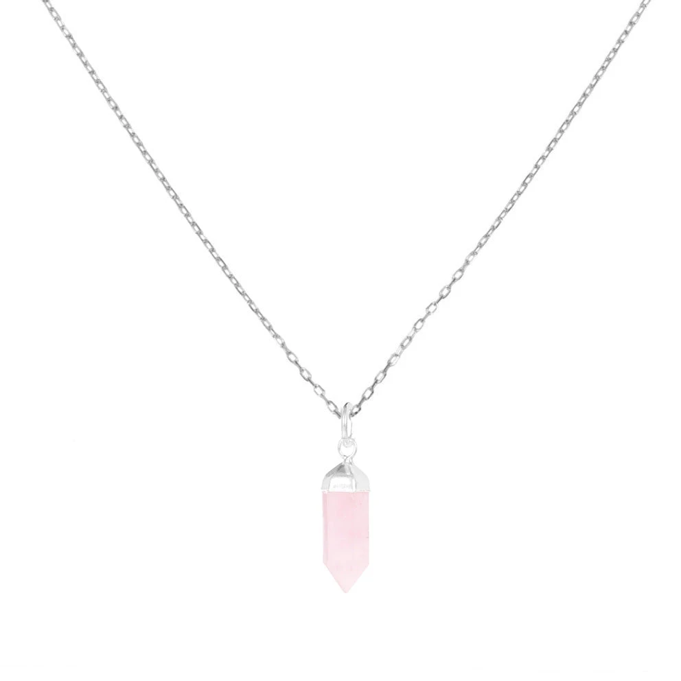 - Collar de Plata 925 con forma de Obelisco que sirve como péndulo, engarzado en Cuarzo Rosa