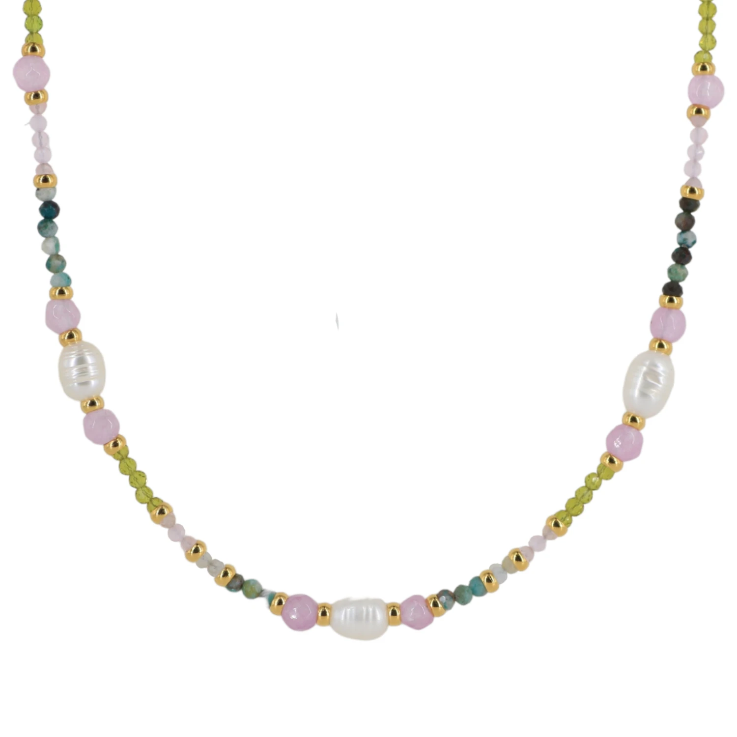 Collar de bolitas hecho a mano con piedras naturales y bolitas de acero dorado en hilo de acero por lo que es resistente