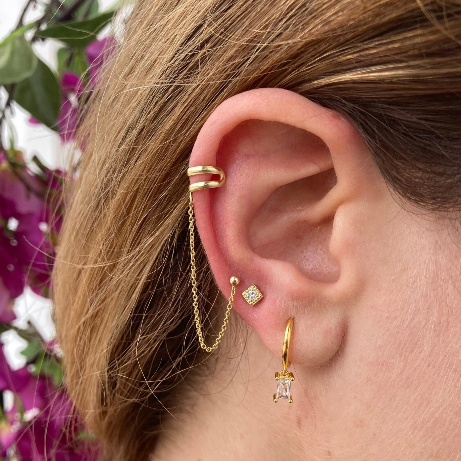 Pendiente doble de presión con cadena y earcuff doble. Solo se necesita una perforación para su uso ya que el pendiente de aro doble es un piercing falso.