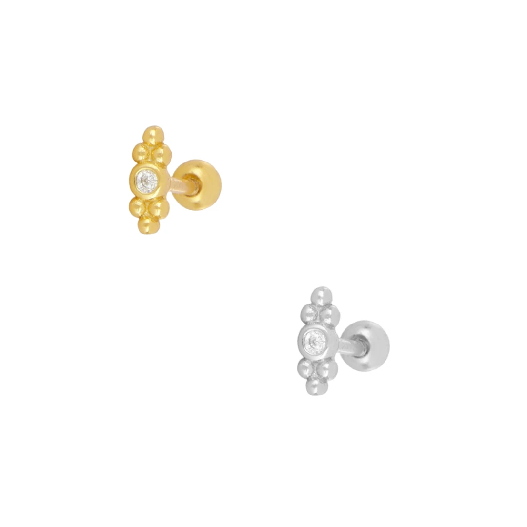 Piercing para la oreja con cierre de rosca de bola. Este pendiente de plata de ley bañado en oro gracias a su cierre es muy cómodo para dormir. Si buscas un piercing para el hélix o segundo pendiente y dormir cómoda este es una opción perfecta.