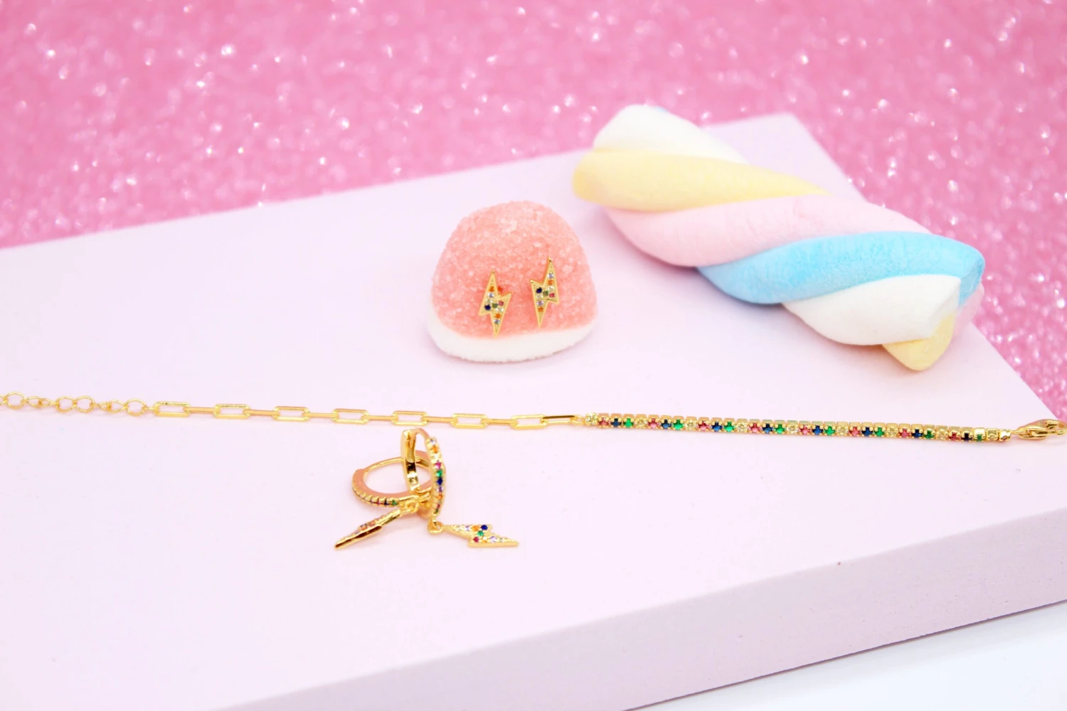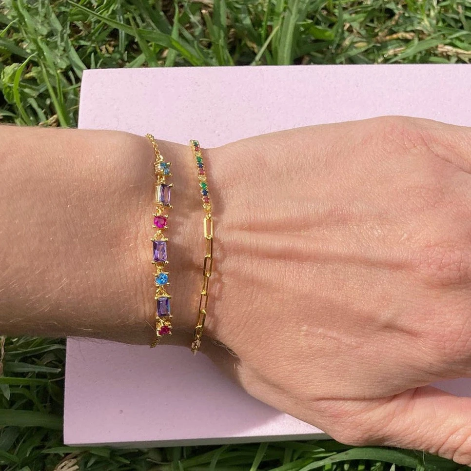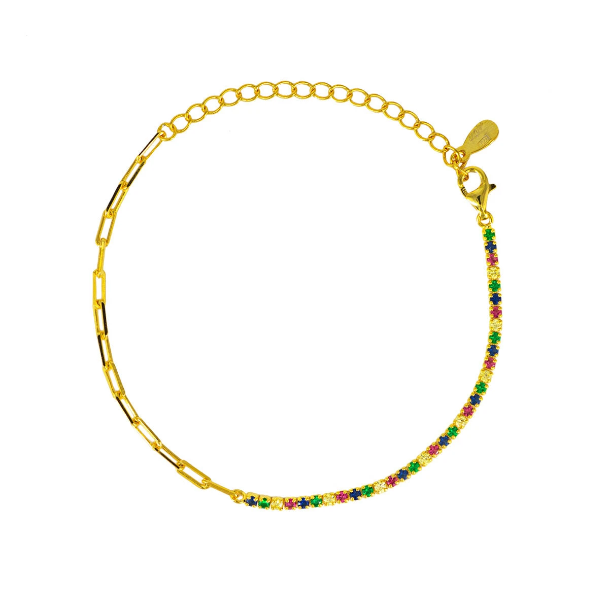 Pulsera con contraste de cadenas, por un lado pequeñas circonitas de colores engarzadas unidas a una cadena de eslabones